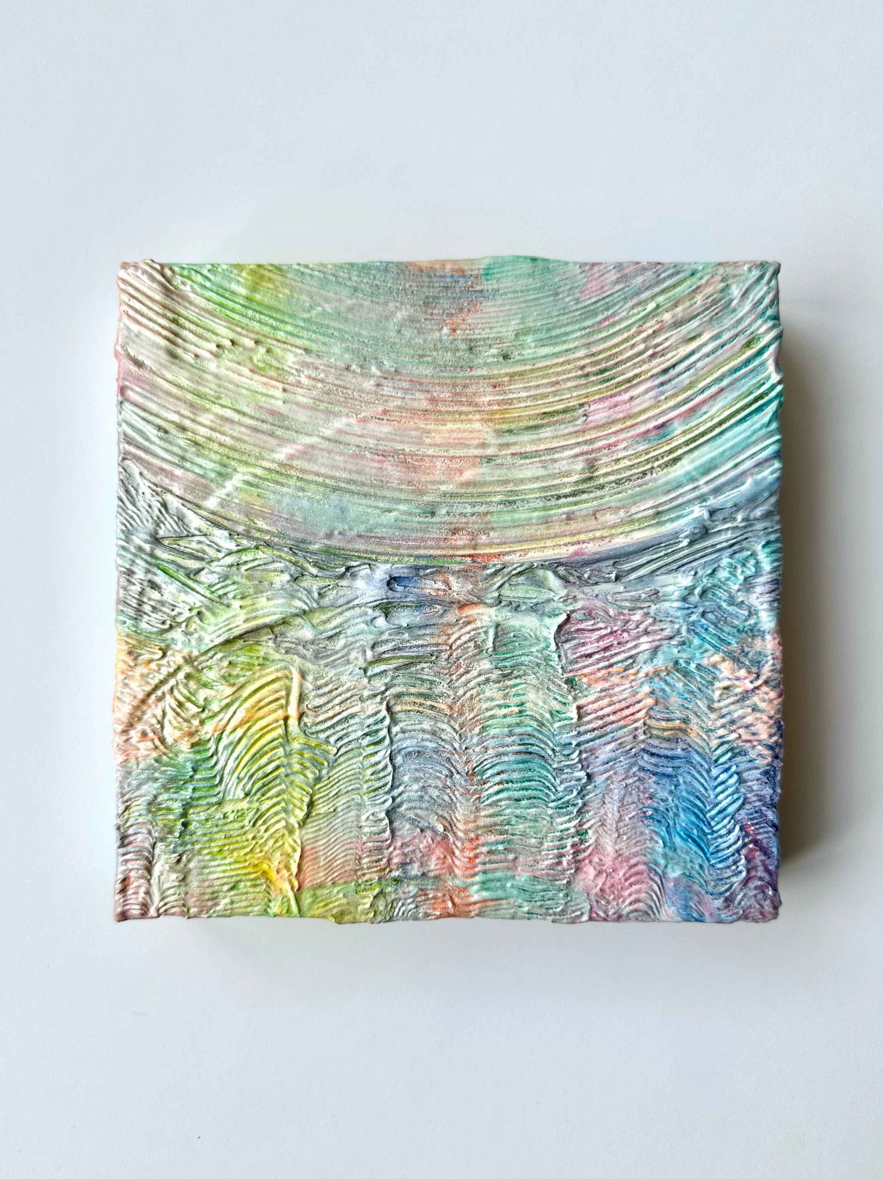 Soft gradients of rainbow hues drift across the surface like a tide that speaks in silence.
